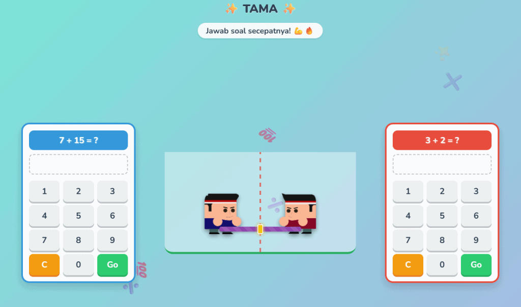 TAMA (Tarik Matematika) adalah sebuah permainan interaktif bergaya Tug of War (Tarik Tambang) yang dirancang khusus untuk mengasah kecepatan dan ketepatan berhitung siswa. Dalam game ini, matematika tidak lagi membosankan, melainkan menjadi senjata utama untuk memenangkan pertandingan!